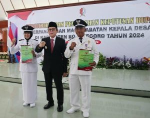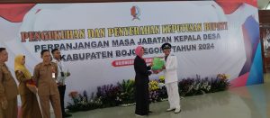 Bojonegoro, Jendelanusanews.Com. Penjabat (Pj) Bupati Bojonegoro Adriyanto mengukuhkan 408 kepala desa (kades) yang mendapatkan perpanjangan masa jabatan. Kegiatan digelar Senin (10/6/2024) di Pendopo Malowopati Bojonegoro. Para kades diharapkan terus menggali potensi wilayah, berinovasi dan menjalankan pemerintahan sesuai regulasi, serta menjadi penyambung aspirasi masyarakat.