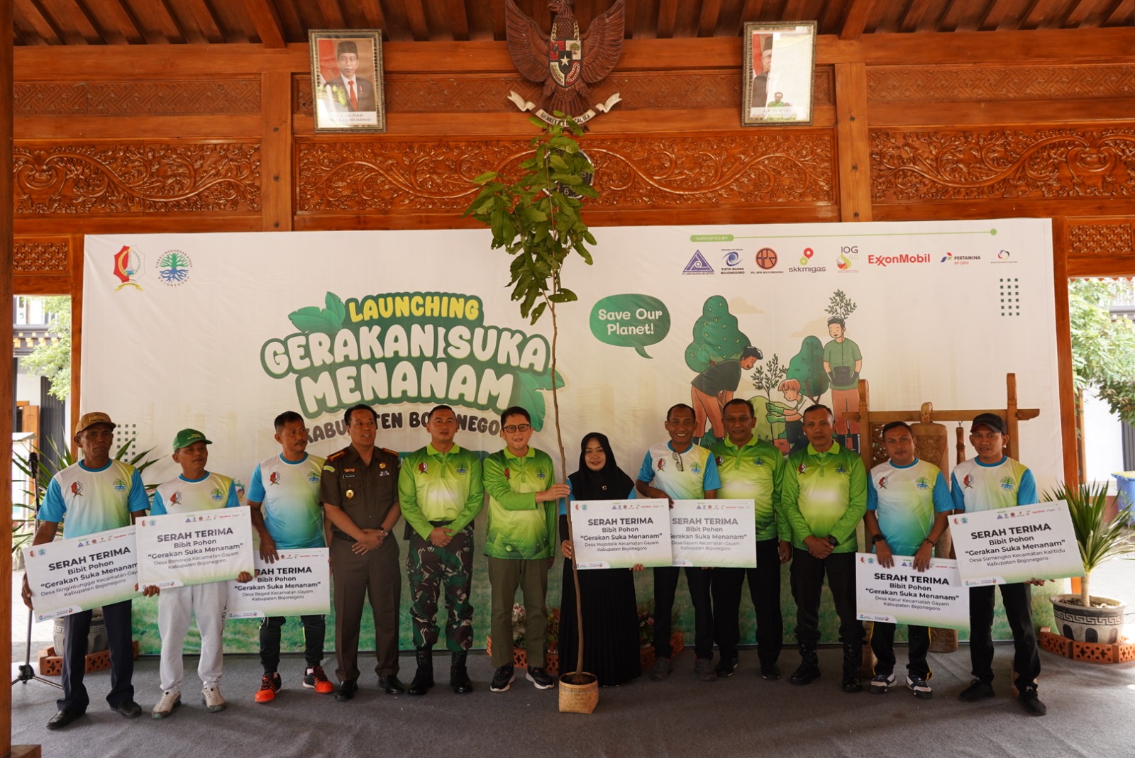 Bojonegoro, jendelanusanews.com. Upaya adaptasi dan mitigasi perubahan iklim melalui upaya reduksi emisi karbon, Pj. Bupati Bojonegoro melaunching Gerakan Suka Menanam yang diselenggarakan oleh Dinas Lingkungan Hidup Kab. Bojonegoro, rabu (20/12). Di Pendopo Balai Desa Gayam, Kec. Gayam, Pj. Bupati Bojonegoro dalam sambutannya menyampaikan bahwa dengan gerakan suka menanam dapat terciptanya investasi hijau yang berdampak baik terhadap kesehatan lingkungan dan kesejahteraan masyarakat.