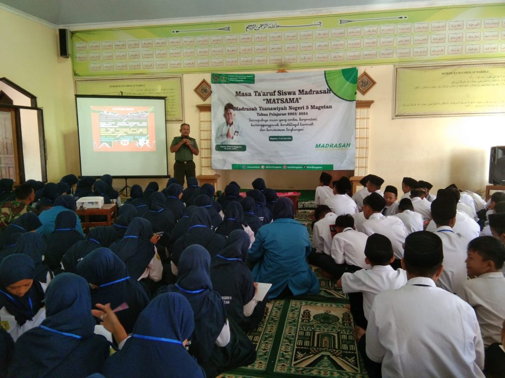Panekan, jendelanusanews.com – Bati Tuud Koramil tipe B 0804/03 Panekan Kodim 0804/Magetan Peltu Sudarto memberikan materi Wawasan Kebangsaan (Wasbang), kedisiplinan dan karakter kepada ratusan siswa-siswi MTsN 5 Magetan di Masjid Madrasah Tsanawiah Negeri 5 Magetan. Dusun Djoso Desa Turi Kecamatan Panekan Kabupaten Magetan. Selasa (18/7/2023).