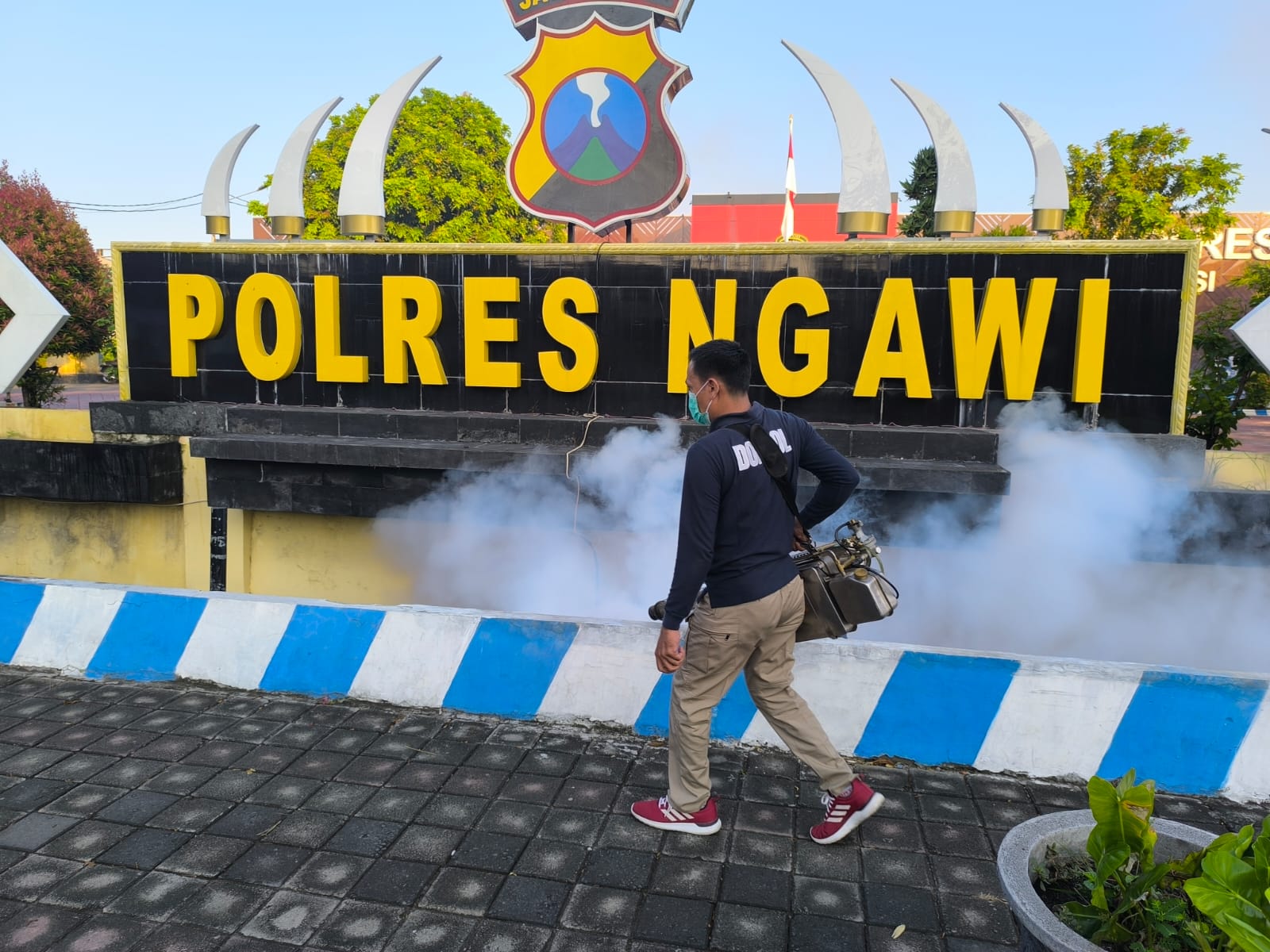 Langkah selanjutnya setelah kerja bakti, sebagai antisipasi untuk hal-hal yang tidak diinginkan di area perkantoran dan asrama, maka Sidokkes Polres Ngawi bersama dengan Tim fogging RS Bhayangkara Tk III Nganjuk melakukan fogging.