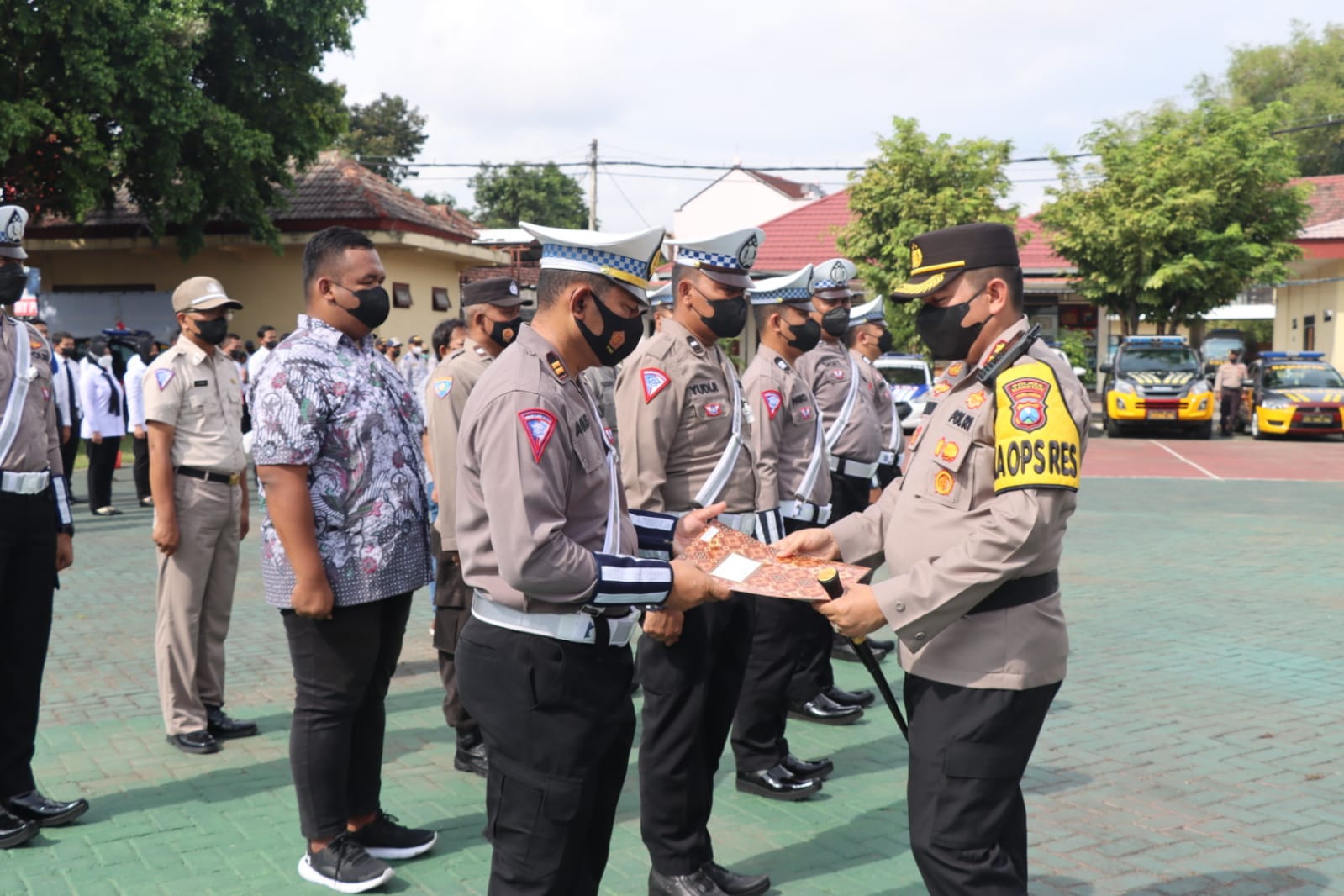 Selesai kegiatan apel gelar pasukan, Kapolres Magetan memberikan penghargaan terhadap personil yang berprestasi, kepada 7 personel yang terdiri 5 anggota sat lantas dan 2 anggota Bhabinkamtibmas, serta 2 masyarakat umum yang telah ikut membantu tugas kepolisian di Magetan. (Sihumas/ardhi)