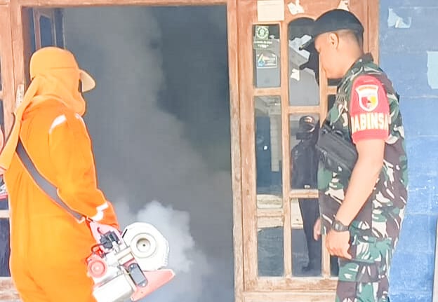 Bojonegoro, Jendelanusanews. Com.- Bintara Pembina Desa atau Babinsa Koramil 21/Sukosewu Kodim 0813 Bojonegoro, Serma Agus Zaenuri, turut mendampingi petugas Dinas Kesehatan Kabupaten Bojonegoro melaksanakan kegiatan fogging sebagai upaya pencegahan timbulnya penyakit Demam Berdarah Dengue (DBD) di Desa Sukosewu Kecamatan Sukosewu Kabupaten Bojonegoro.