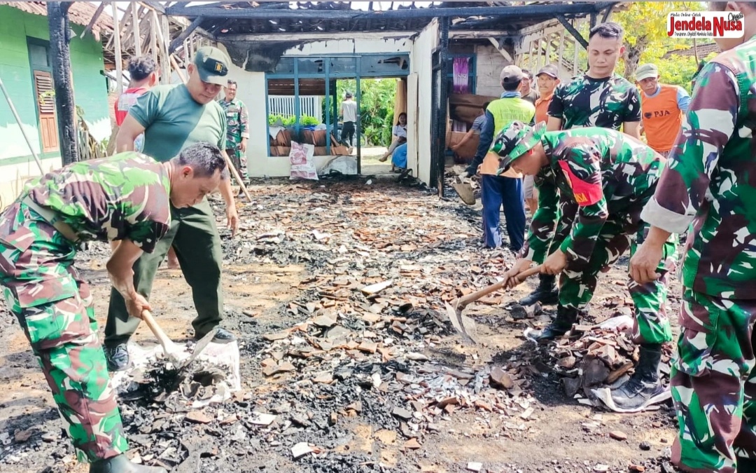 Puing-puing sisa rumah terbakar itu tampak berserakan, dan dibersihkan oleh anggota Babinsa Koramil 0813-24/Temayang bersama perangkat Desa Kedungsari dan warga masyarakat sekitar.