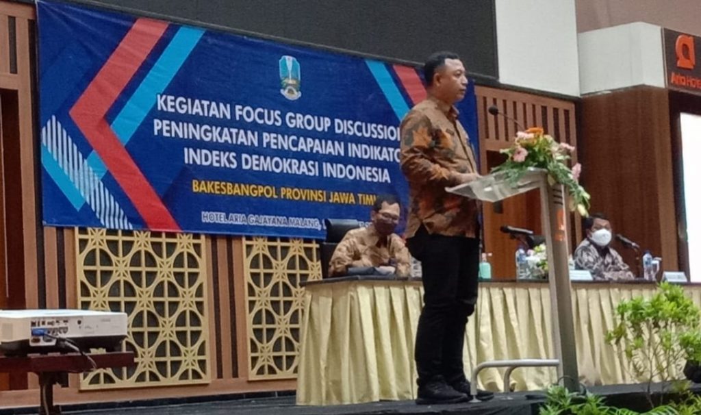 Malang, JNN – Badan Kesatuan Bangsa Dan Politik Provinsi Jawa Timur yang di kepalai R. Heru Wahono Santoso, S.Sos, MM tengah menggelar kegiatan “Focus group discussion peningkatan pencapaian Indikator Indeks Demokrasi Indonesia” pada Kamis (17/03/2022).