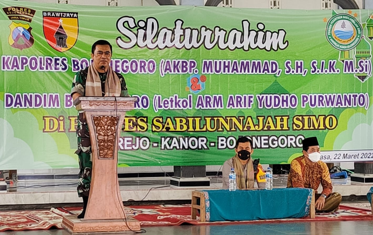 Bojonegoro, JNN, Dalam rangka menciptakan situasi kambtibmas yang lebih aman serta kondusof, Komandan Kodim (Dandim) 0813 Bojonegoro Letkol Arm Arif Yudo Purwanto, bersama Kapolres AKBP Muhammad, melaksanakan silaturahmi ke Pondok Pesantren (Ponpes) Sabilunnajah Desa Simorejo, Kecamatan Kanor, Kabupaten Bojonegoro, Jawa Timur, Selasa (22/3/2022).