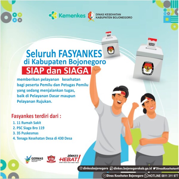 Bojonegoro, Jendelanusanews. Com. Pemungutan suara Pemilu akan digelar 14 Februari 2024 mendatang. Pemerintah Kabupaten Bojonegoro melalui Dinas Kesehatan telah menyiapkan tenaga dan pelayanan kesehatan di beberapa titik. Fasilitas Pelayanan Kesehatan (Fasyankes) akan bersiaga selama pemungutan dan penghitungan suara Pemilu Serentak Tahun 2024.