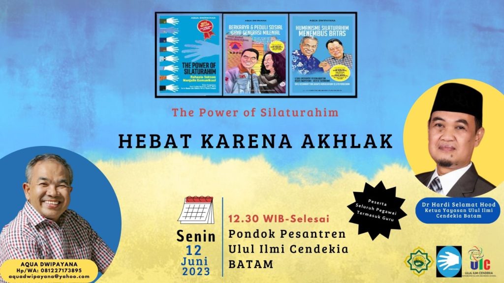 “Karakter emas ini harus menjadi orientasi kita semua sehingga kehidupan kita dapat kita jalani dengan sebanyak mungkin memberikan manfaat dan kemaslahatan bagi sebanyak mungkin orang di sekitar kita,” ungkap Dr Aqua Dwipayana pada Sharing Komunikasi dan Motivasi bertajuk “Hebat Karena Akhlak” Senin 12 Juni 2023 di Pondok Pesantren Ulul Ilmi Cendikia Batam mulai pukul 12.30 WIB.