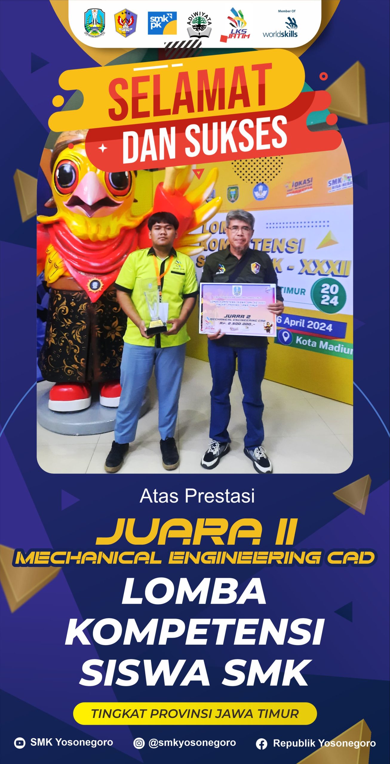 “Alhamdulillah SMK Yosonegoro tahun ini meraih juara 2 dari total sebanyak 42 peserta seluruh provinsi, tetap kita berbangga atas pencapaian tahun ini, meskipun di tiga tahun sebelumnya SMK Yosonegoro juara 1 berturut-turut,” katanya pada Kamis (02/05/2024).