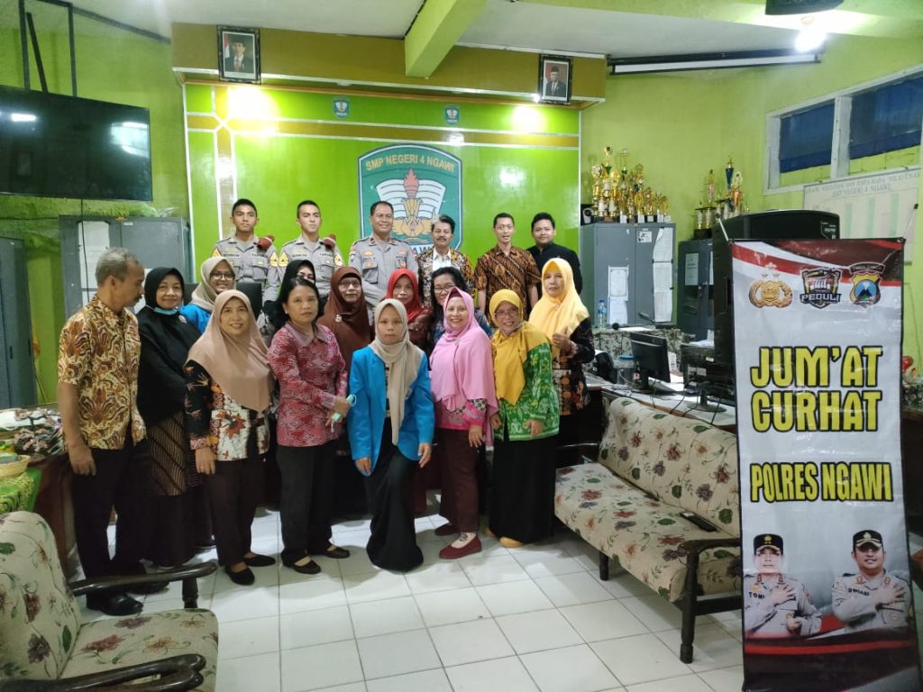 Jumat Curhat dilaksanakan di SMP Negeri 4 Ngawi Jln.Trunojoyo Kel. Karangtengah Kec/ Kab.Ngawi, dengan sasaran para karyawan dan guru di sekolah.