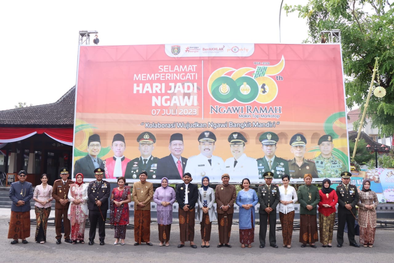 upacara peringatan Hari Jadi Ngawi yang ke 665 Tahun 2023 dengan tema “Kolaborasi Wujudkan Ngawi Bangkit Mandiri”, di Pendopo Wedya Graha Kab. Ngawi, Jumat (7/7/2023).