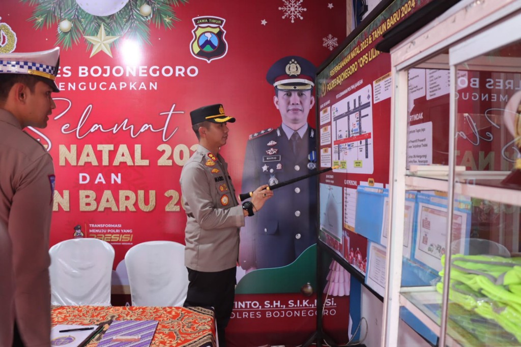 Kunjungan pertama di Posyan yang berada di Alun-alun Kota Bojonegoro, Kapolres Bojonegoro mengatakan bahwa kunjungan ini sekaligus pengecekan Pos dan untuk memastikan sarana prasarana dalam Pos tersebut benar – benar terpenuhi dan kesiapan personel yang terlibat pengamanan Pos Natal dan Tahun Baru 2024 (Nataru).
