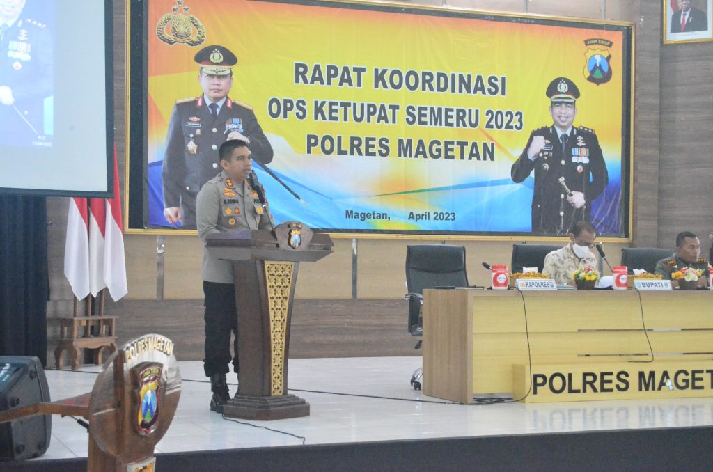 Magetan, jendelanusanews.com – Kapolres Magetan AKBP Muhammad Ridwan, Pimpin kegiatan Rapat Koordinasi Operasi Ketupat Semeru Tahun 2023 dalam rangka pengamanan Hari Raya Idul Fitri 1444 H dan pengamanan arus mudik maupun arus balik Tahun 2023 di wilayah Magetan, bertempat di Gedung Pesat Gatra Polres Magetan, Kamis (13/4/2023).