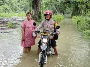 Aiptu Sudiro mendatangi warga yang terkena banjir untuk membantu mengamankan barang-barang untuk ditaruh di tempat yang aman dan menghimbau agar anak-anak tidak lepas dari pengawasan orang tuanya.