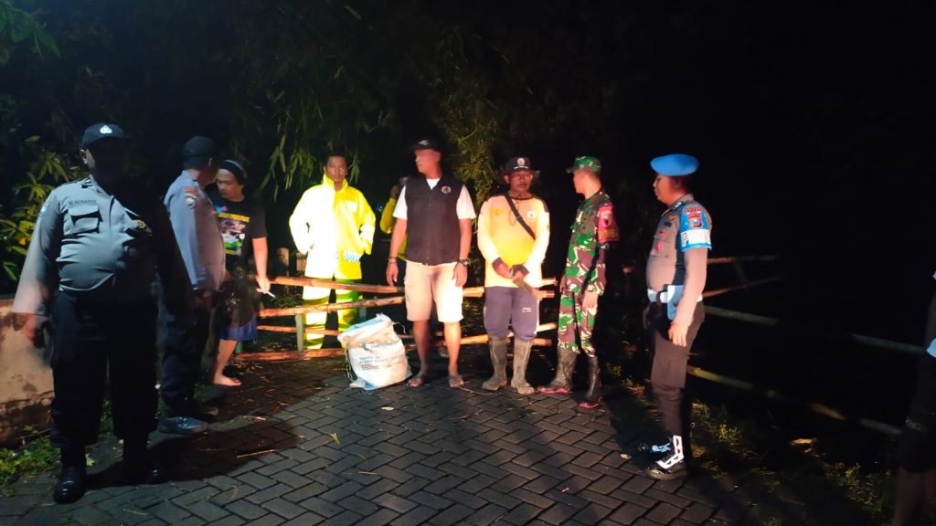 Anggota Polsek Kedunggalar Polres Ngawi Polda Jatim bersama TNI dan BPBD serta relawan setempat dengan sigap segera turun tangan dengan memberi palang/tumpukan bambu atau tanda ke arah jembatan dan berjaga serta membantu warga yang rumahnya terdampak banjir.