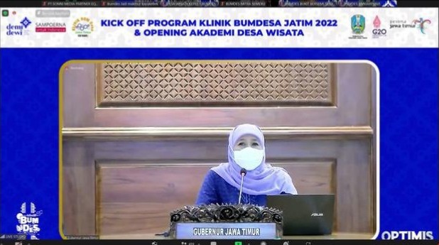 Gubernur Jatim, Khofifah Indar Parawansa, resmi membuka program Klinik BUM Desa Jatim secara virtual melalui zoom cloud meeting, Rabu (2/2/2022). Khofifah menegaskan komitmen menjadikan Klinik BUM Desa Jatim menjadi salah satu pintu masuk proses penyejahteraan masyarakat desa.