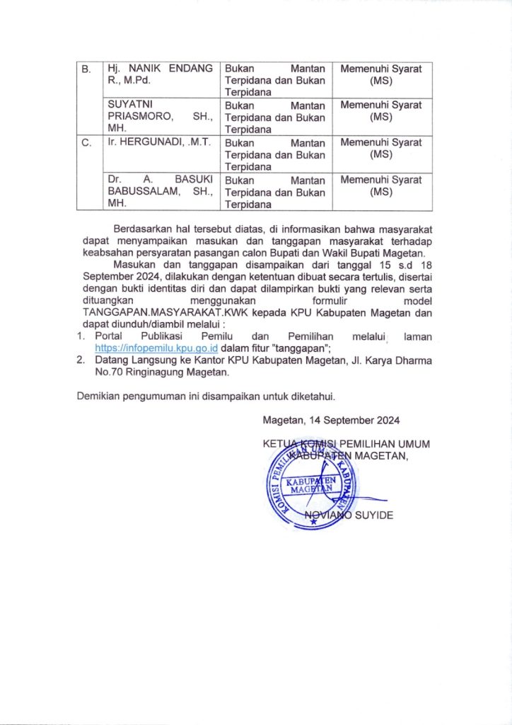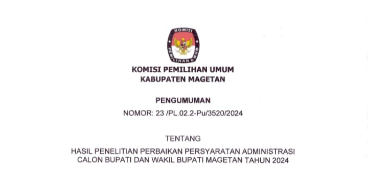 Komisi Pemilihan Umum Kabupaten Magetan mengumumkan Hasil Penelitian Perbaikan Persyaratan Administrasi Calon Bupati dan Wakil Bupati Magetan tahun 2024, berdasarkan hal tersebut, diinformasikan bahwa masyarakat dapat menyampaikan masukan dan tanggapan masyarakat terhadap keabsahan persyaratan pasangan Calon Bupati dan Wakil Bupati Magetan.