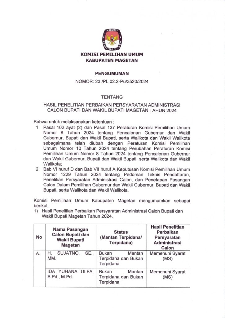 Berikut pengumuman KPU Magetan Hasil Penelitian Perbaikan Persyaratan Administrasi Calon Bupati dan Wakil Bupati Magetan tahun 2024:
