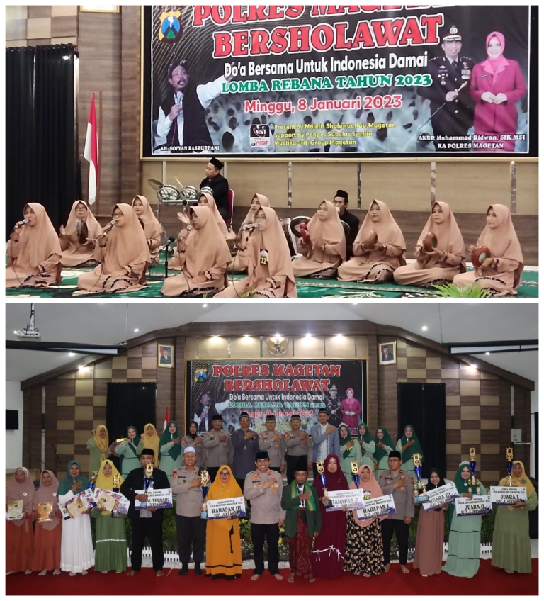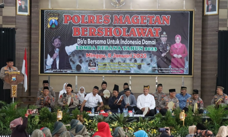 Untuk kali ke-3 lomba Rebana dilaksanakan Polres Magetan dengan menggandeng Majelis Sholawat Kabupaten bertempat di Aula Pesat Gatra Mapolres Magetan, kali ini ada 26 group yang ikut dalam perlombaan, Minggu (8/1/2023).