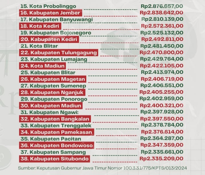 Bojonegoro, JNN.Com. Provinsi Jawa Timur telah menerbitkan Keputusan Gubernur tentang Upah Minimum Kabupaten/Kota se-Jawa Timur tahun 2025. Keputusan ini untuk mewujudkan upah yang lebih realistis sesuai kondisi daerah dan kemampuan perusahaan.