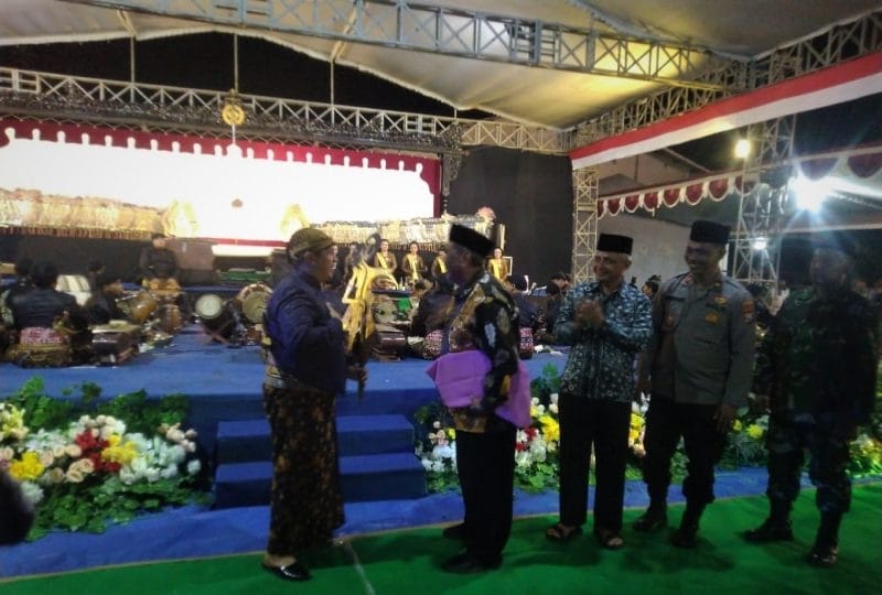 Kepala Desa Sukorejo H. Budi Suprayitno menyerahkan wayang Werkudoro kepada Dalang Ki Bayu Aji Pamungkas, yang menandai dimulainya Pagelaran Wayang tersebut.