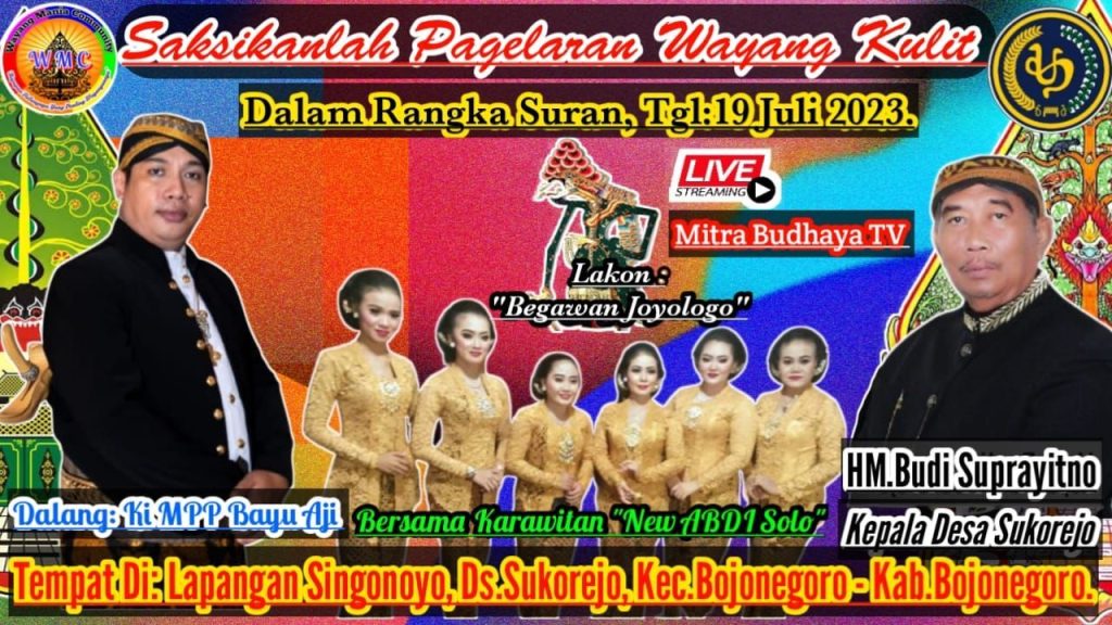 Pagelaran Wayang kulit dengan dalang Ki Bayu Aji Pamungkas dari Surakarta dengan Lakon Begawab Joyo Logo. Kegiatan digelar di Lapangan Singonoyo, Desa Sukorejo, Kecamatan Kota Bojonegoro, Rabu (19/07/2023) malam.