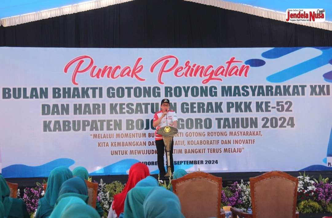 Bojonegoro, JNN.Com. Pemerintah Kabupaten (Pemkab) Bojonegoro melaksanakan kegiatan puncak peringatan Bulan Bhakti Gotong Royong Masyarakat (BBGRM) XXI, Jumat (20/9/2024). Acara yang digelar di Lapangan Sidorejo, Kecamatan Sukosewu ini dirangkai dengan Hari Kesatuan Gerak (HKG) ke-52 PKK Kabupaten Bojonegoro tahun 2024.