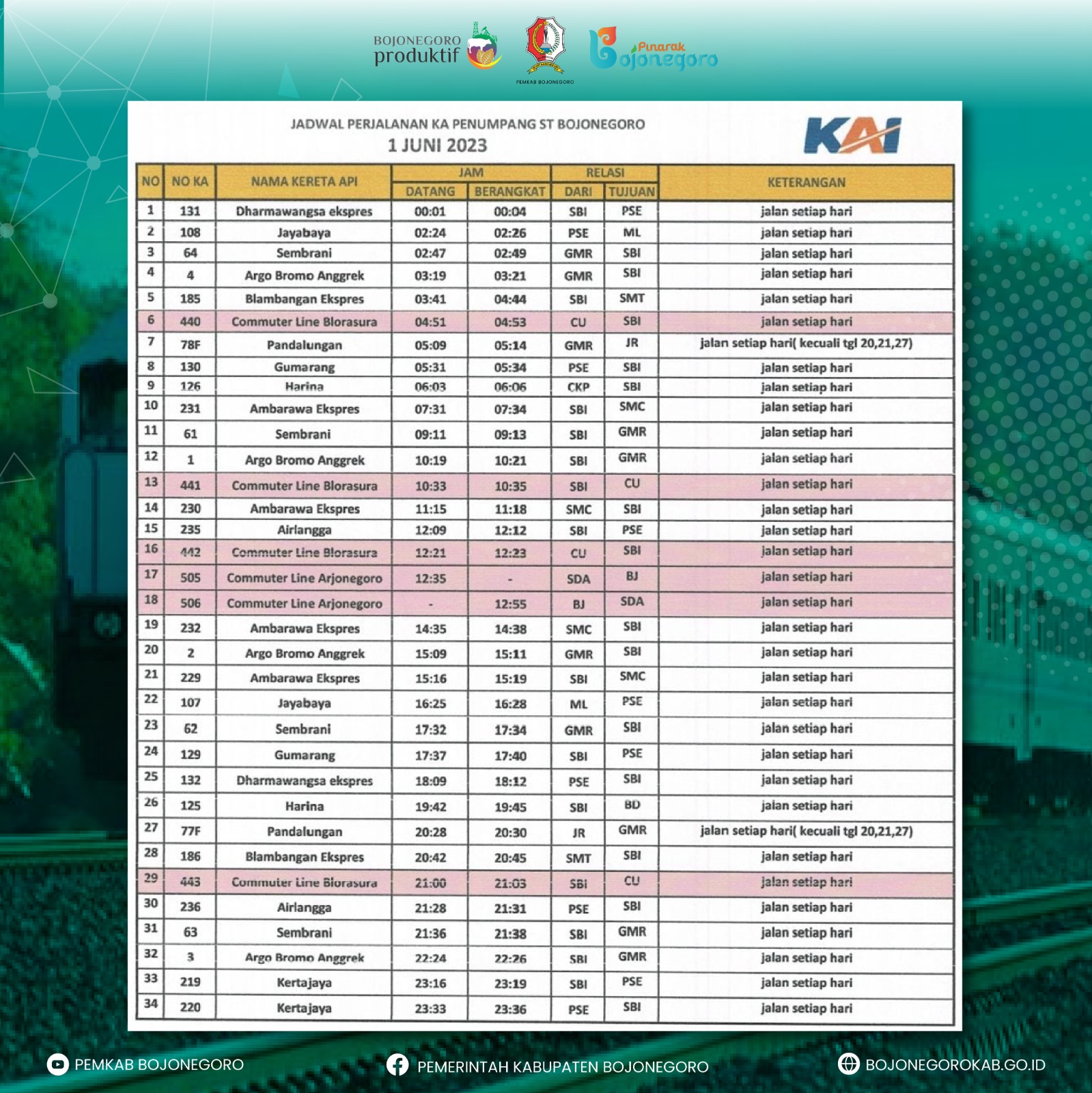 b. Perubahan jadwal pemberangkatan dan pemberhentian (perjalanan) kereta api yang melintasi Kabupaten Bojonegoro sebagaimana jadwal terlampir.