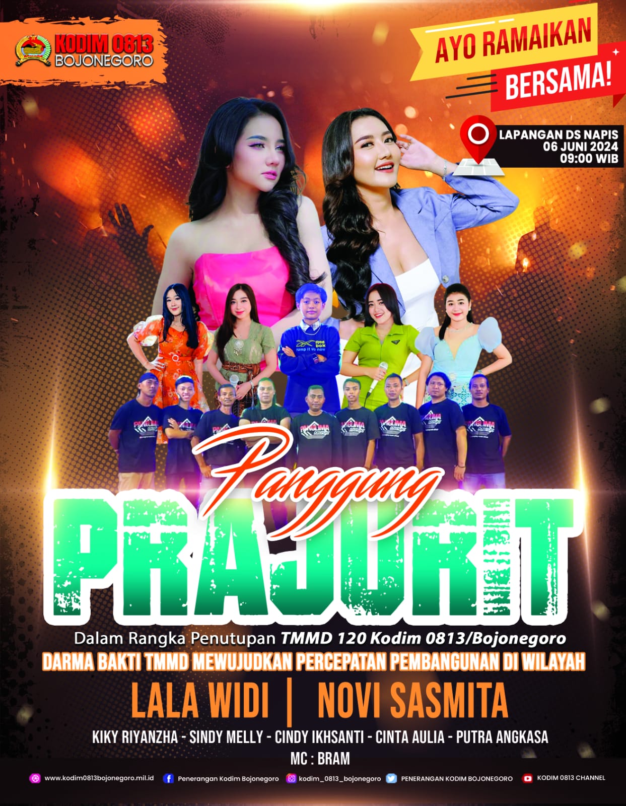 Bojonegoro, Jendelanusanews.Com. Rangkaian acara penutupan kegiatan program TNI Manunggal Membangun Desa atau TMMD ke- 120 tahun 2024 diwilayah Kabupaten Bojonegoro bakal diramaikan dengan digelarnya ‘Panggung Prajurit’ yang menghadirkan sejumlah artis Ibu Kota Jawa Timur, seperti Lala Widi, Novi Sasmita, Kiki Riyanzha, Sindhy Melly, Putra Angkasa dan lainya.