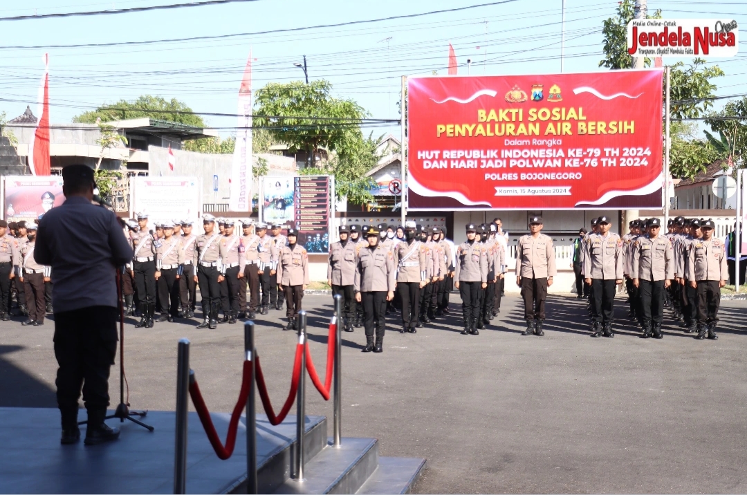 Bojonegoro , JNN.Com. Polres Bojonegoro melakukan apel pemberangkatan Bakti Sosial membagi air bersih dalam rangka HUT Kemerdekaan RI Ke-79 dan Hari Jadi Polwan Ke-76 Tahun 2024.