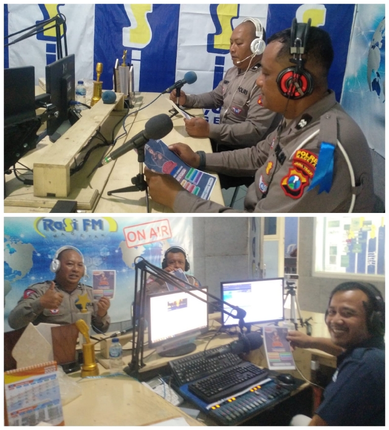 Sosialisasi dan himbauan dilakukan lewat siaran langsung melalui radio oleh personil dari Unit Kamsel lantas Polres Magetan di Studio Radio RASI FM Magetan, Rabu (8/2/2023).