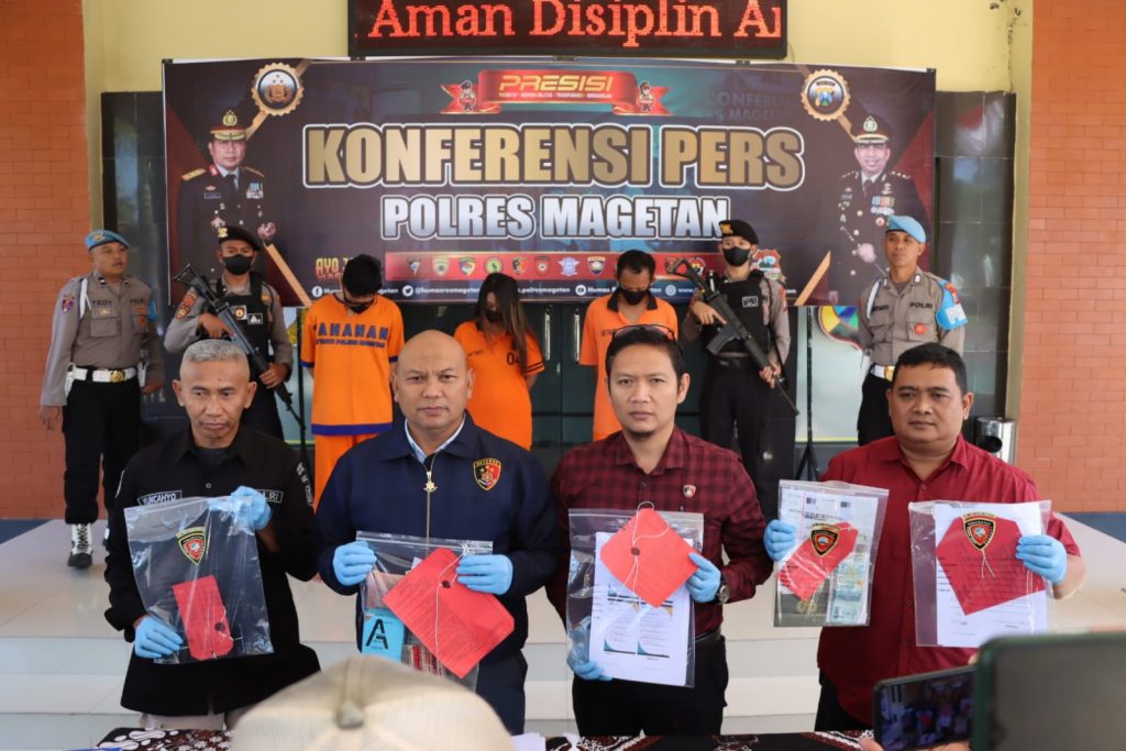 Disampaikan Kapolres Magetan AKBP Muhammad Ridwan, melalui Kasat Reskrim AKP Rudi Hidajanto saat konferensi pers di Halaman Polres Magetan, Kamis (27/7/2023) ada tiga tersangka yang telah diamankan.