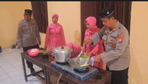 Di dapur yang diadakan di halaman Polsek, anggota Polsek dan Bhayangkari Polsek Ngrambe saling bekerja sama mengolah dan memasak bahan makanan untuk dibagikan ke masyarakat.