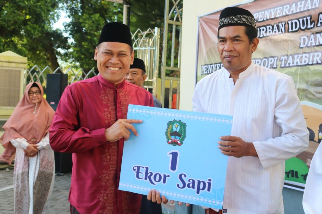 Dalam kesempatan tersebut Sujatno menyerahkan satu ekor sapi jantan sebagai hewan kurban kepada Panitia di Masjid Agung Baitussalam.Selain itu juga menyerahkan berbagai piagam dan pengahargaan kepaada pemenang juara takbir keliling yang dilaksanakan malam sebelumnya.“Semoga hewan kurban tersebut bermanfaat bagi segenap masyarakat Magetan,” pungkas Sujatno.(ard)