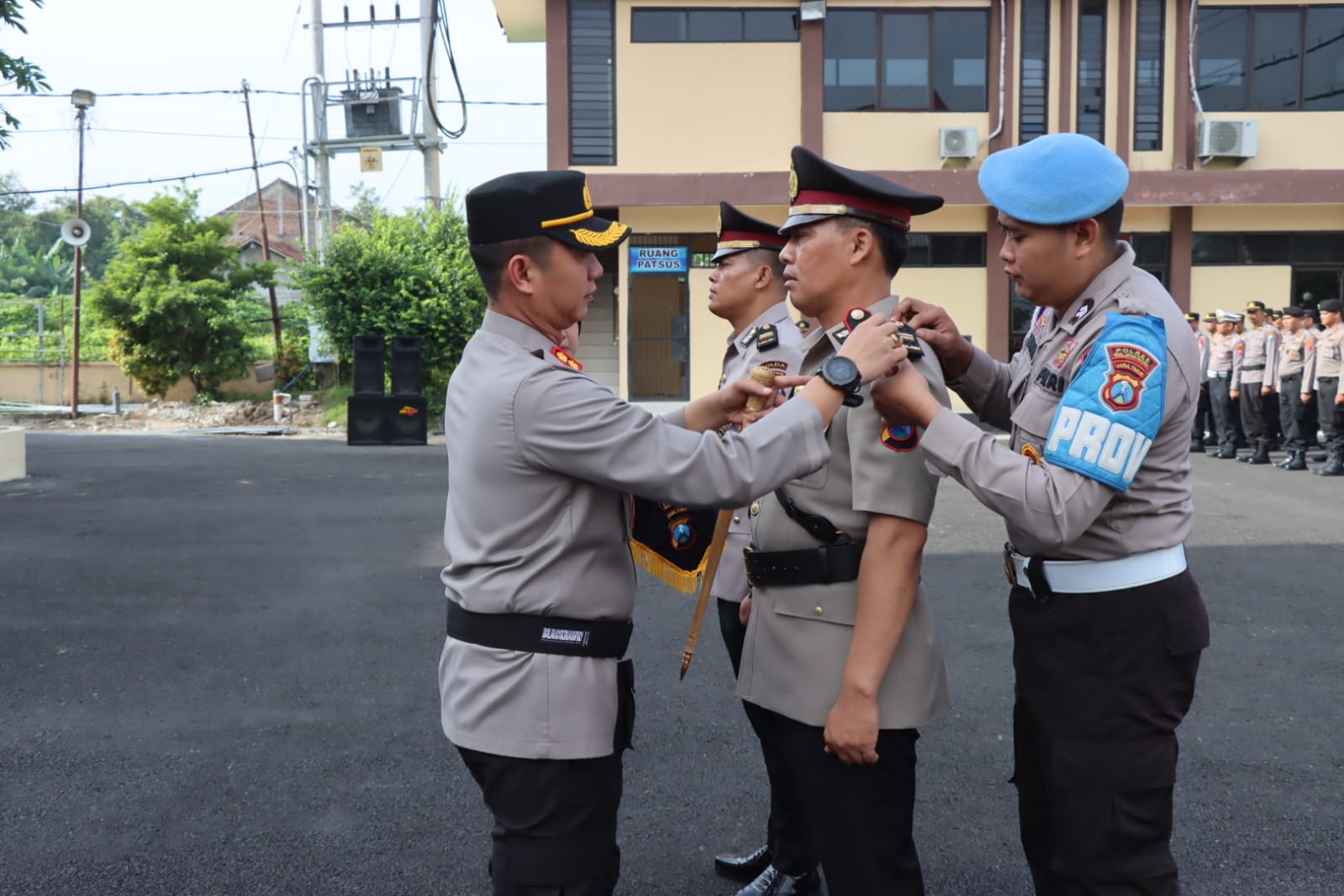 Disela-sela sertijab, juga dilaksanakan Kenaikan Pangkat Pengabdian dari Aiptu ke Ipda personel Polsek Sukosewu, Ipda Safril.