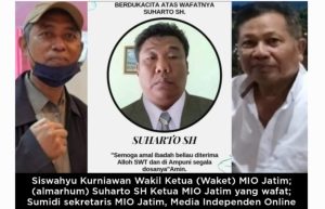 “innalillahi wa inna ilaihi rojiun. Kami berduka – cita yang sedalam-dalamnya atas wafat rekan kami Mas Suharto SH yang juga Ketua DPW MIO Jatim,” ungkap Sumidi sekretaris DPW MIO Jatim yang bersama Siswahyu Kurniawan wakil Ketua (Waket) MIO Jatim dkk merasakan duka yang mendalam atas wafat (Mas) Suharto.