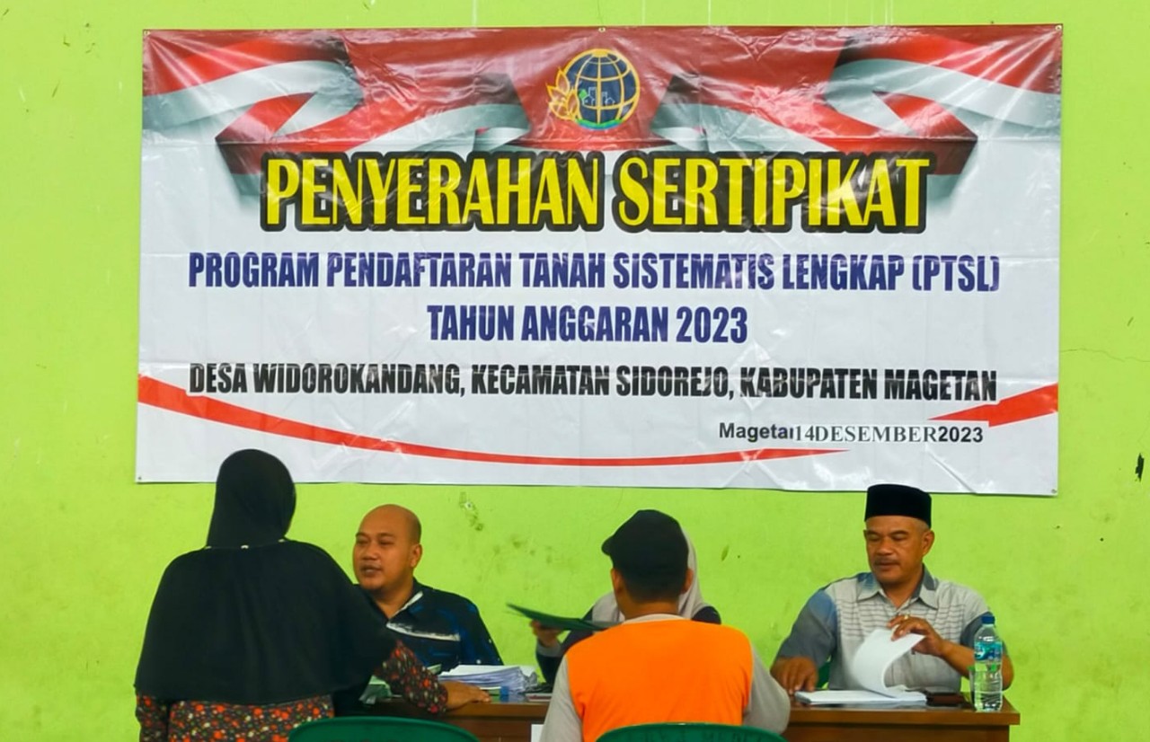 Terima Sertifikat Tanah Program PTSL Magetan, jendelanusanews.com – Pemerintah Kabupaten Magetan terus bersinergi dengan Badan Pertanahan Nasional ( BPN ), berupaya menyelesaikan program pemerintah pusat untuk memberikan hak kepemilikan tanah yang jelas berupa sertifikat kepada seluruh masyarakat. Sumringah pun tampak dari wajah para pemohon sertifikat tanah program PTSL Desa Widorokandang, Kecamatan Sidorejo, Kabupaten Magetan, Jatim….